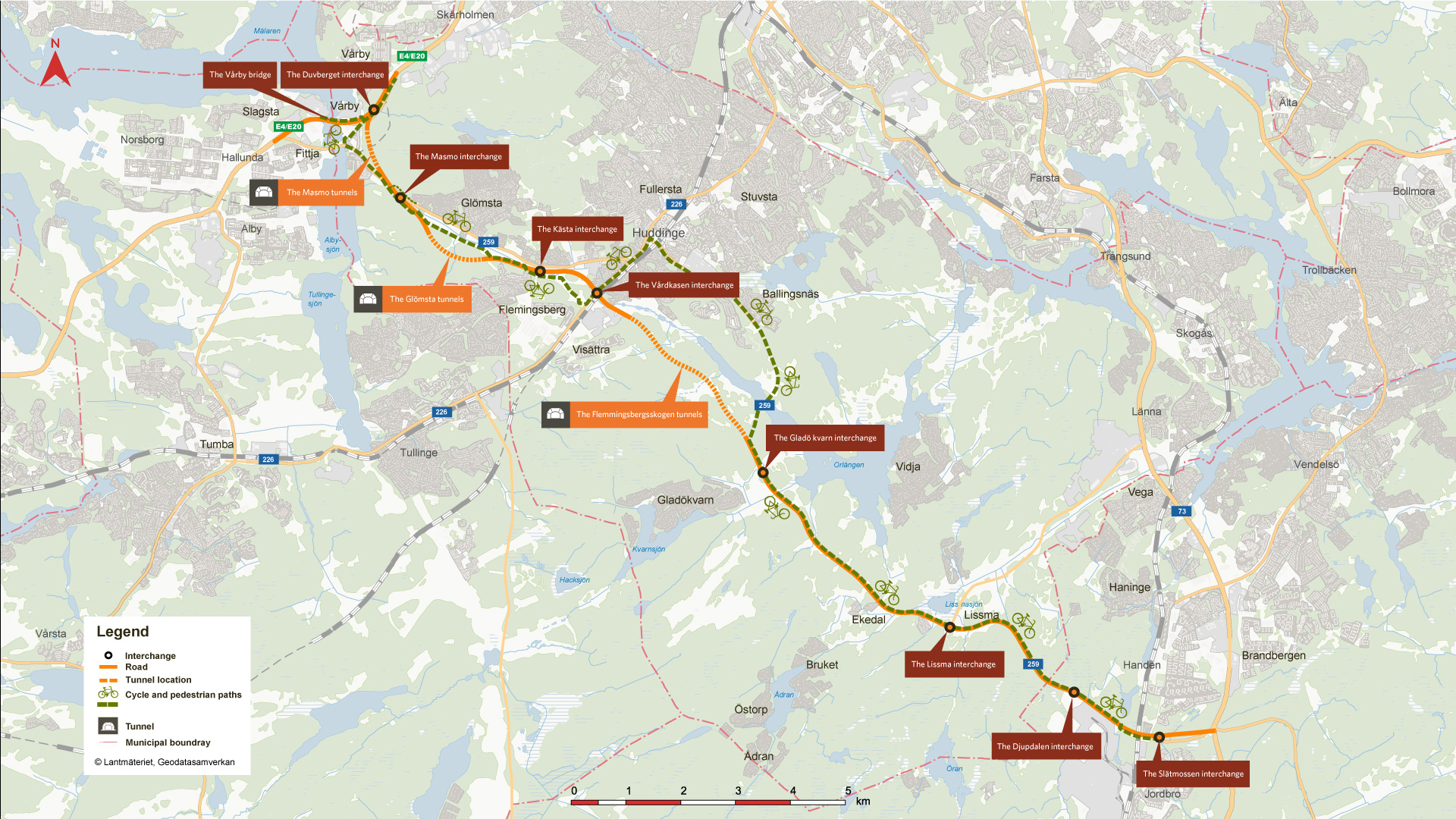 The Södertörn Crosslink Project is a new route in southern Stockholm. The road, which will be approximately twenty km long, stretches from E4/E20 at Vårby backe in the vicinity of Kungens kurva to road 73 at the Jordbro motorway junction in the municipality of Haninge. The project also includes a bicycle route/pedestrian path running alongside the road.