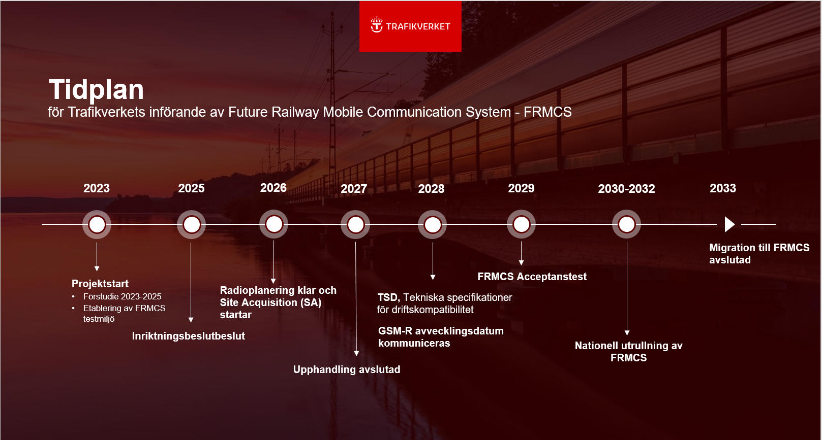 Målet är att avveckla GSM-R senast 2033. Trafikverkets tidplan för att införa FRMCS i det svenska järnvägsnätet pågår i flera faser, med förberedelser, upphandling och utrullning fram till 2032.
