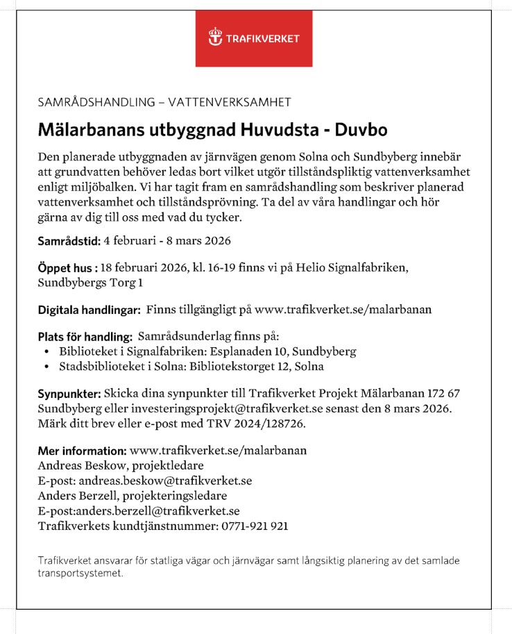Här kan du läsa och ladda hem dokument från vårt arbete med att planera utbyggnaden av Mälarbanan, Tomteboda-Kallhäll. Dokumenten öppnas i nytt fönster.