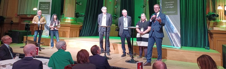 Henrik Dahlin (Green Cargo), Johan Wadman (Svensk Kollektivtrafik) och Anna Ericsson (Trafikverket) från JBS styrelse på scenen med infrastrukturminister Andreas Carlson. Längst till vänster dagens moderatorer Ulf Carlsson, Trafikverket, och Britt-Marie Olsson, SJ.