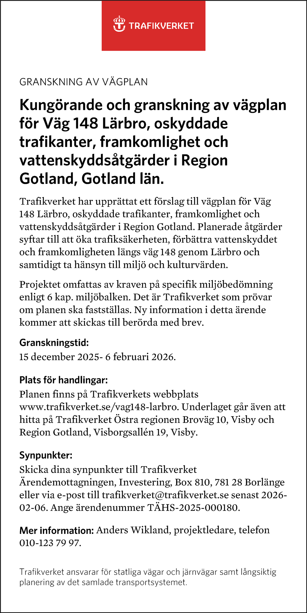 Här finns möjlighet att läsa och ladda hem dokument om projektet väg 148, Lärbro, ny gång- och cykelväg, framkomlighet och grundvattenskydd.